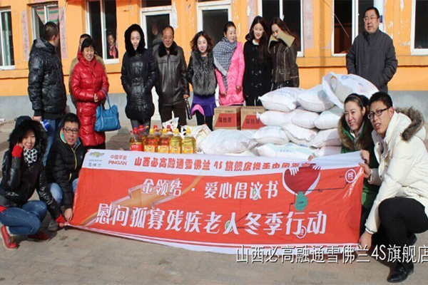 冬季已至,天氣漸冷。山西必高融通汽車銷售服務有限公司攜手中國平安,聯合廣大愛心車主,在11月30日舉辦金領結愛心倡議書暖冬活動。13臺雪佛蘭汽車,冒著嚴寒驅車前往大同縣周士莊鎮駕遇造村、孟家造村、遇駕山村,開展捐贈活動。本次活動捐贈對象:孤寡病殘老人,無子女,無經濟來源的五保戶;他們沒有子女承歡膝下,贍養盡...